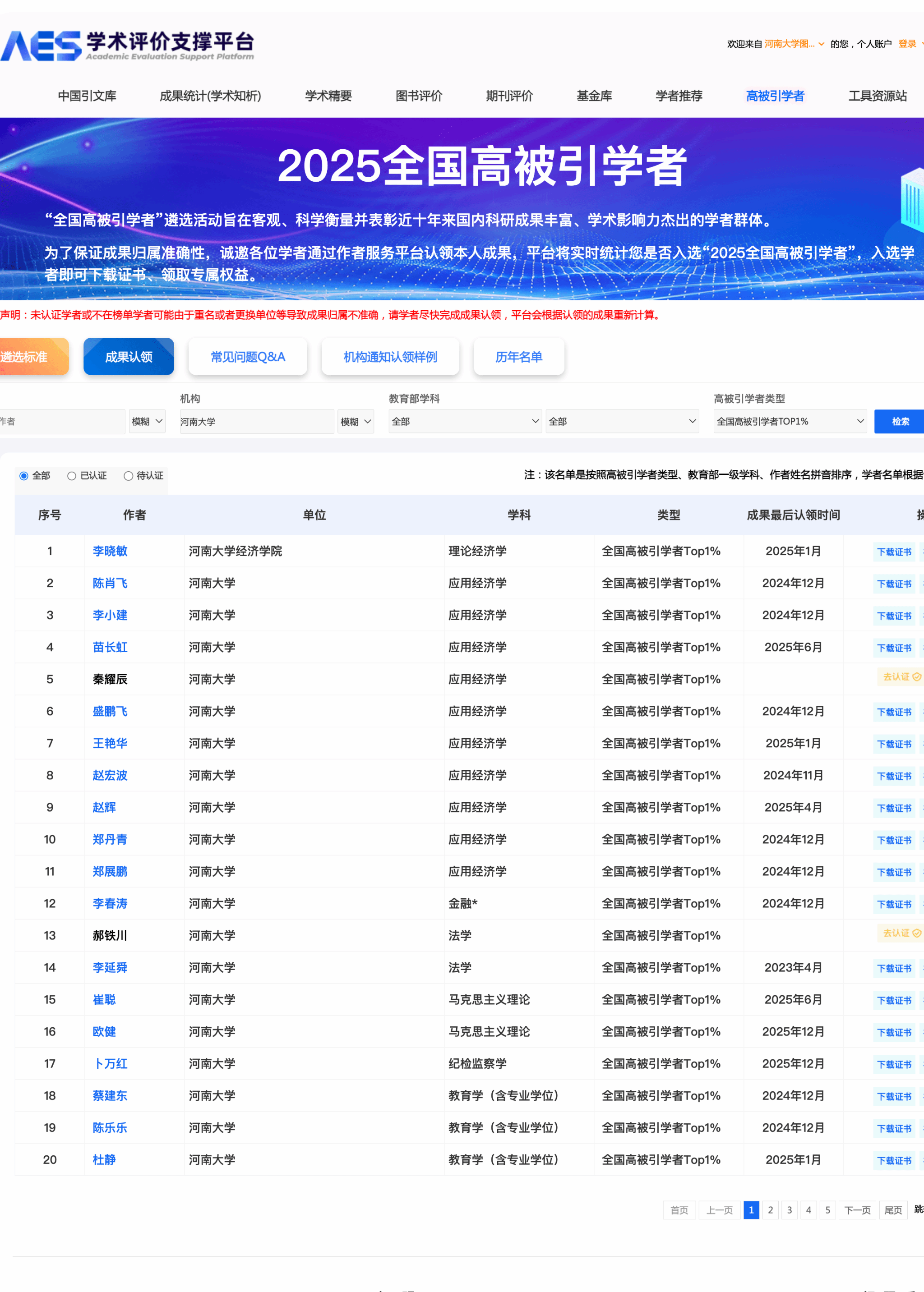 近日,中国知网公布了2025年知网高被引学者名单。中国知网·中国科学文献计量评价研究中心基于中国知网收录的国内学术期刊论文和会议论文,开展学者学术影响力客观评价,遴选出“2025中国知网高被引学者”名单。河南大学共81位专家学者荣获“2024年度知网高被引学者TOP1%”,254位专家学者荣获“2024年度知网高被引学者TOP5%”。这些入选学者涉及经济学、教育学、中国语言文学、中国史、马克思主义理论、法学等多个学科领域,在印证其个人学术能力的同时,也彰显出我校人文社科研究的深厚底蕴和广泛影响力。